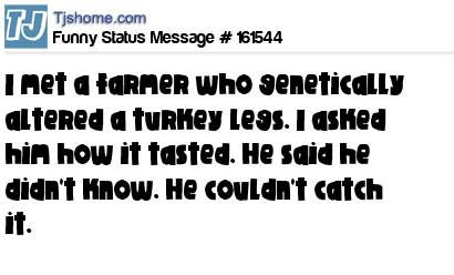 X says I met a farmer who genetically altered a turkey legs. I asked him how it tasted. He said he didn't know. He couldn't catch it.
