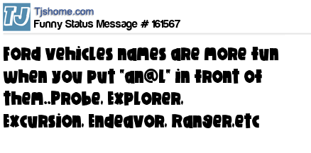 - # 61982 You ever notice how most Ford vehicle names are more fun when you put "anal" in front of them? Probe, Explorer, Excursion, Endeavor, Ranger, Focus...