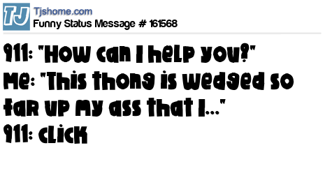 X says 911: "How can I help you?" Me: "This thong is wedged so far up my ass that I..." 911: click