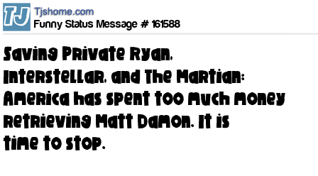 - # 161385 Saving Private Ryan, Interstellar and now The martian. How much money does America have to spend to keep saving Matt Damon's ass?