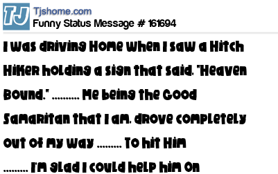 X says I was driving Home when I saw a Hitch Hiker holding a sign that said, "Heaven Bound." .......... Me being the Good Samaritan that I am, drove completely out of my way ......... To hit Him ......... I'm glad I could help him On his Way.