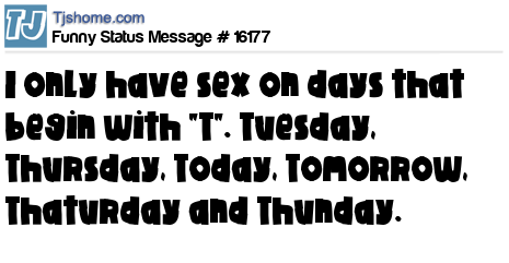 X I only have sex on days that begin with "T". Tuesday, Thursday, Today, Tomorrow, Thaturday and Thunday.