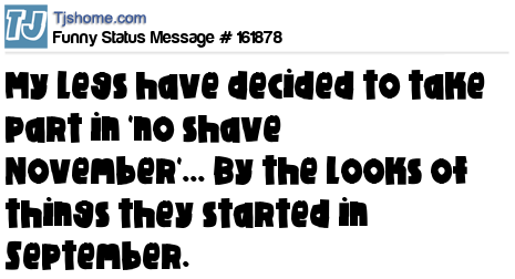 - # 139730 For every guy that's participating in, "No shave November", I just want to let you know that it will also be, "No pu$$y November" for you as well.