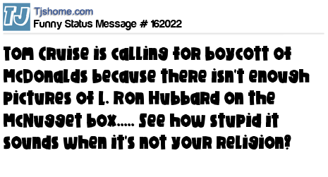 X Tom Cruise is calling for boycott of McDonalds because there isn't enough pictures of L. Ron Hubbard on the McNugget box..... See how stupid it sounds when it's not your religion?