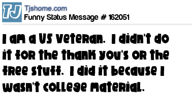 X says I am a US Veteran. I didn't do it for the thank you's or the free stuff. I did it because I wasn't college material.
