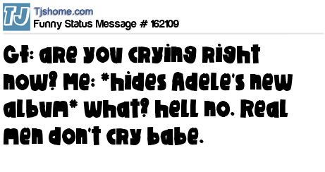 X says Gf: are you crying right now? Me: *hides Adele's new album* what? hell no. Real men don't cry babe.