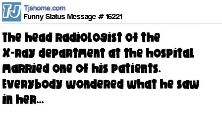 X says the head radiologist of the X-ray department at the hospital married one of his patients. Everybody wondered what he saw in her...