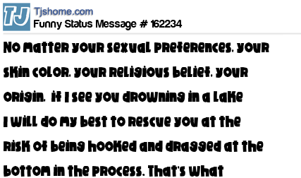X says No matter your sexual preferences, your skin color, your religious belief, your origin, if I see you drowning in a lake I will do my best to rescue you at the risk of being hooked and dragged at the bottom in the process. That's what humans are for.