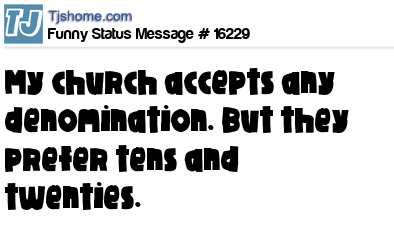 X says My church accepts any denomination. But they prefer tens and twenties.