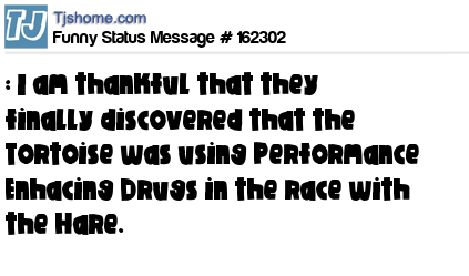 X says : I am thankful that they finally discovered that the Tortoise was using Performance Enhacing Drugs in the race with the Hare.