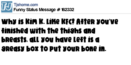 X says Why is Kim K. like KFC? After you've finished with the thighs and breasts, all you have left is a greasy box to put your bone in. 🍗🍖🤑🤑😂😂😂