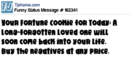 X says Your Fortune Cookie for Today: A long-forgotten loved one will soon come back into your life. Buy the negatives at any price.