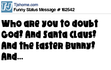 X says Who are you to doubt God? And Santa Claus? And the Easter Bunny? And...
