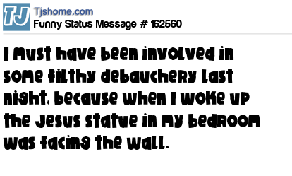 X says I must have been involved in some filthy debauchery last night, because when I woke up the Jesus statue in my bedroom was facing the wall.