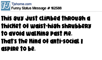 X says This guy just climbed through a thicket of waist-high shrubbery to avoid walking past me. That's the kind of anti-social I aspire to be.