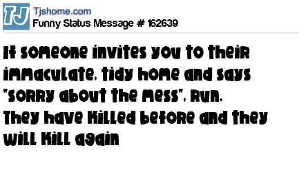 - # 164688 If someone invites you to their immaculate, tidy home and says "sorry about the mess", run. They have killed before and they will kill again.