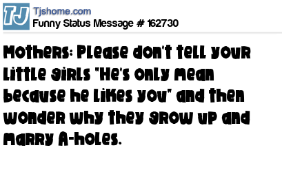 X says Mothers: Please don't tell your little girls "He's only mean because he likes you" and then wonder why they grow up and marry A-holes.