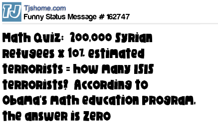 X says Math Quiz: 200,000 Syrian refugees x 10% estimated terrorists = how many ISIS terrorists? According to Obama's math education program, the answer is Zero