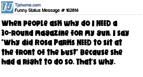 X says When people ask why do I NEED a 30-round magazine for my gun, I say "Why did Rosa Parks NEED to sit at the front of the bus?" Because she had a right to do so. That's why.
