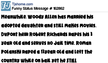 X says Meanwhile, Woody Allen has married his adopted daughter and still makes movies. DuPont heir Robert Richards rapes his 3 year old and serves no jail time. Roman Polanski raped a 13year old and left the country while on bail yet he STILL receives awards