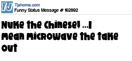 - # 133369 My gf and I were eating Chinese take-out and my dog starts begging at the table for a treat. I said "You don't want this, Boy. This is Chinese food. Come to think of it, so are you."