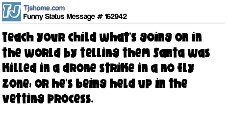 X says Teach your child what's going on in the world by telling them Santa was killed in a drone strike in a no fly zone; or he's being held up in the vetting process.