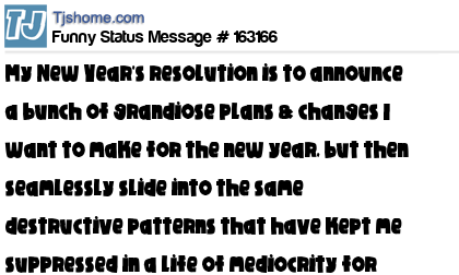 X says My New Year's resolution is to announce a bunch of grandiose plans & changes I want to make for the new year, but then seamlessly slide into the same destructive patterns that have kept me suppressed in a life of mediocrity for as long as I can remember.