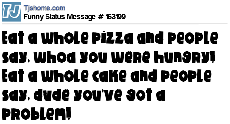 X says Eat a whole pizza and people say, whoa you were hungry! Eat a whole cake and people say, dude you've got a problem!