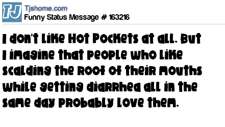 X I don't like Hot Pockets at all. But I imagine that people who like scalding the roof of their mouths while getting diarrhea all in the same day probably love them.