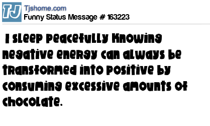 X I sleep peacefully knowing negative energy can always be transformed into positive by consuming excessive amounts of chocolate.