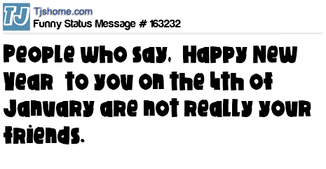 - # 191062 After the 7th day of January. Please keep your "Happy New Year" messages to yourself. We probably, have already cried, been depressed, been angry at someone, eaten leftover food more than once and paid an unexpected bill. It's no longer new or happy.