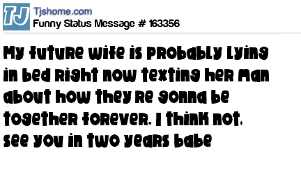 - # 156481 My future wife is probably lying in bed right now texting her man about how they’re gonna be together forever. I think not, see you in five years sweetheart