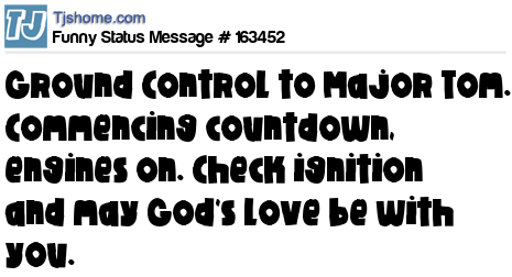 X Ground Control to Major Tom. Commencing countdown, engines on. Check ignition and may God's love be with you.