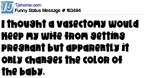 - # 204374 Really feel bad for my neighbor.... He thought a vasectomy would keep his wife from getting pregnant but apparently it only changes the color of the baby.