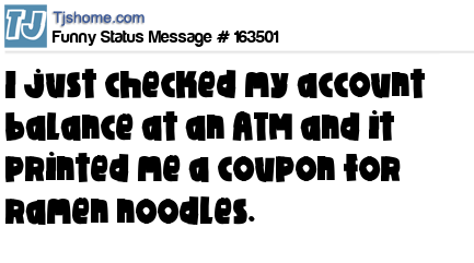 - # 170937 I just checked my account balance at the ATM, it printed me out a coupon for ramen noodles.