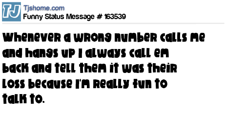 X says Whenever a wrong number calls me and hangs up I always call em back and tell them it was their loss because I'm really fun to talk to.