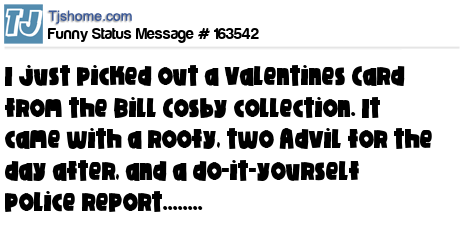 X says I just picked out a Valentines Card from the Bill Cosby collection. It came with a roofy, two Advil for the day after, and a do-it-yourself police report........