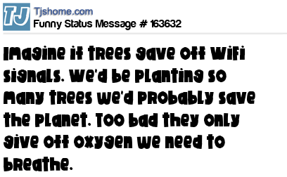 X says Imagine if trees gave off WiFi signals. We'd be planting so many trees we'd probably save the planet. Too bad they only give off oxygen we need to breathe.