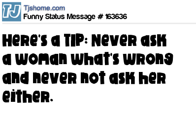 X Here's a TIP: Never ask a woman what's wrong and never not ask her either.