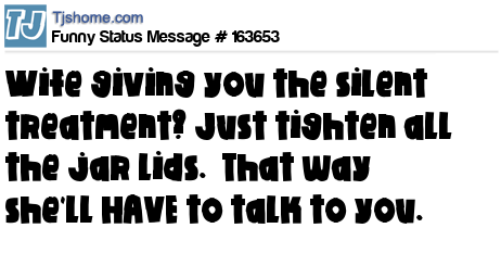 X says Wife giving you the silent treatment? Just tighten all the jar lids. That way she'll HAVE to talk to you.
