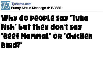 - # 178500 Why do people say "Tuna Fish sandwich?" That's like saying "Chicken Bird sandwich."