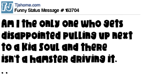 X says Am I the only one who gets disappointed pulling up next to a Kia Soul and there isn't a hamster driving it. . .