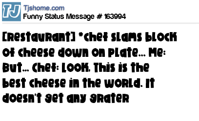 X says [restaurant] *chef slams block of cheese down on plate... Me: But… Chef: Look, This is the best cheese in the world. It doesn't get any grater