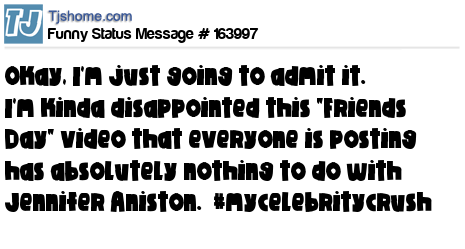 X says Okay, I'm just going to admit it. I'm kinda disappointed this "Friends Day" video that everyone is posting has absolutely nothing to do with Jennifer Aniston. #mycelebritycrush