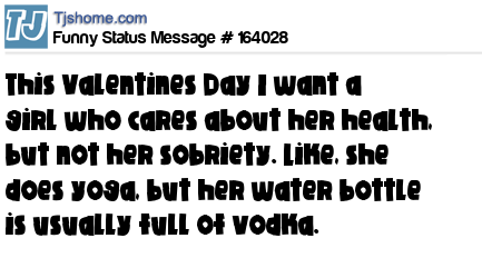 X says This Valentines Day I want a girl who cares about her health, but not her sobriety. Like, she does yoga, but her water bottle is usually full of vodka.