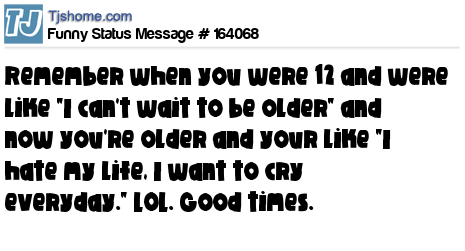 X says Remember when you were 12 and were like "I can't wait to be older" and now you're older and your like "I hate my life, I want to cry everyday." LOL. Good times.