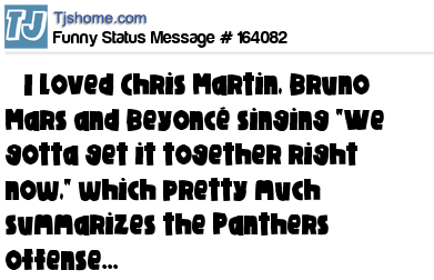 X says ❤ I loved Chris Martin, Bruno Mars and Beyoncé singing "We gotta get it together right now," which pretty much summarizes the Panthers offense...