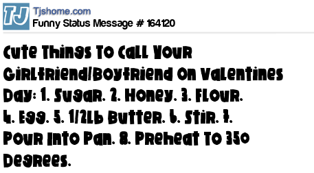 X says Cute Things To Call Your Girlfriend/Boyfriend On Valentines Day: 1. Sugar. 2. Honey. 3. Flour. 4. Egg. 5. 1/2lb Butter. 6. Stir. 7. Pour Into Pan. 8. Preheat To 350 Degrees.