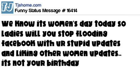 X is we know its women's day today so ladies will you stop flooding facebook with ur stupid updates and liking other women updates.. its not your birthday