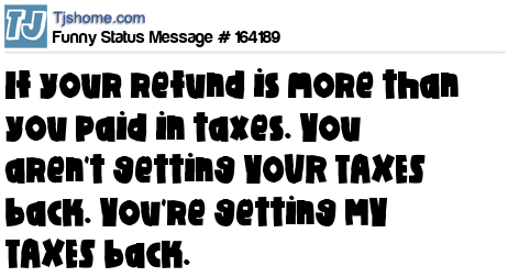 - # 110037 I just figured out my taxes & I have to pay.. But I have to do my part.. Otherwise some guy who paid no taxes in the 1st place wouldn't get a refund.
